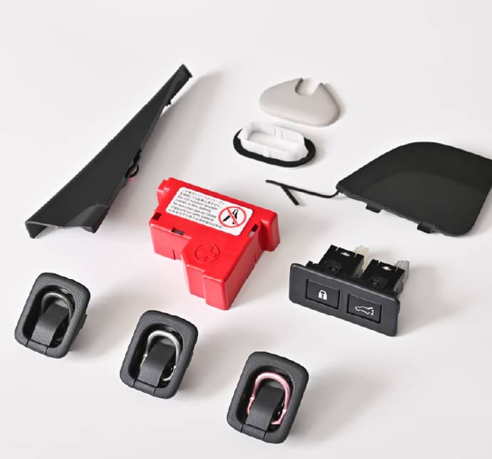 自動車の内外装に使用される数多くの樹脂部品を、射出成形(インジェクション)により製造しています。外装部品ではバンパーにある牽引フックカバー、バッテリーのプラス端子カバーなど、内装部品ではサンバイザーを固定するボルトのキャップなどを製造。構造解析と流動解析の自社内完結を目指し、樹脂成形のシミュレーション技術も高めています。